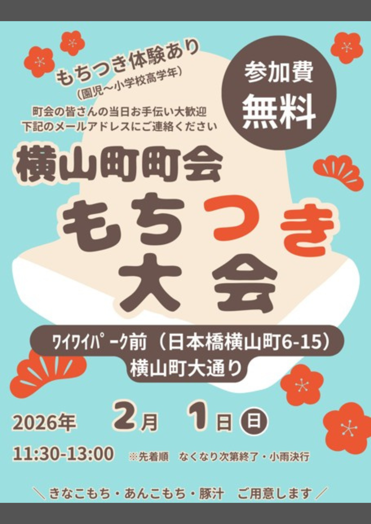 YY Baseのお隣のわいわいパークにて2月1日横山町町会のもちつき大会が初開催です!